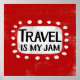 "Viagem is My Jam" é um design de texto divertido com uma forma de sotaque branca cercado por pontos brancos texturizados.