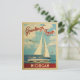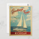 Esta viagens vintage náutica design de Saudações de Michigan apresenta um barco navegando na água com gaivotas e um céu azul cheio de lindas nuvens brancas puffy.