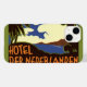 Ilustração vinda do poster de viagens asiático ou etiqueta de bagagem da capital Jakarta, na ilha de Java, na Indonésia, mostrando uma visão do oceano, praia e nuvens no céu através das árvores e montanhas. Hotel Nederlanden, Batavia, Java.