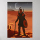 Um guerreiro viking com armadura e escudo parado no planeta vermelho Marte com duas luas no céu. Esta é uma arte gerada por IA.