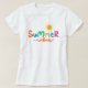 Camiseta feminina com design de vibrações de verão e sol que é perfeita para ajudá-lo a entrar naquele modo de férias lindo. Este design colorido apresenta letras de cores vibrantes e uma ilustração de um sol amarelo e vibrações em caligrafia estilosa.