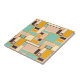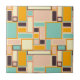 A vibrant abstract pattern with rectangles of varying sizes in teal, orange, peach, and cream tones, outlined in dark brown. Geometric and retro feel.