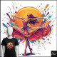 Background/Style: The figure is centered against a large, glowing orange/yellow circular shape, which acts as a radial backdrop for an explosion of chaotic, multi-colored paint splatters (blue, cyan, pink, yellow). The style is high-contrast, expressive, and uses a neon pop art aesthetic.