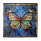 Elevate your home interior with the timeless beauty of this ceramic tile. This design features an intricately detailed butterfly with glowing wings of amber, gold, and teal, set against a rich cobalt and sky blue mosaic background. Created to mimic the look of traditional leaded glass, this piece adds a sophisticated, artistic touch to any space.