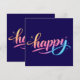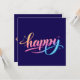 A cheerful and modern "happy" design featuring a beautiful flowing script with a vibrant pastel gradient of orange, pink, and blue. Decorative sparkles and dots add a touch of magic and positivity to this clean, uplifting artwork.