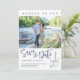 "Viciado em você" Uma pesca à porta, russa, temida Casamento, salvo a data com gancho de pesca segurando anéis de casamento em azul de aço e cinza. Personalize o convite com sua foto de noivado e detalhes do casamento no bloco de texto justificado à esquerda. A parte de trás é acabada com um padrão de rede de peixe azul de aço.