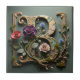 This design is special for its luxurious combination of textures and styles. The dimensional gold scrollwork is characteristic of the ornate Victorian/Baroque period, while the cracked verdigris finish suggests historic antiquity. The deep purple rose and mossy vines intertwining with the letter create a captivating and highly personalized piece of botanical art.