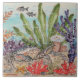 Apresentando corais coloridos, estrelas-do-mar, anêmonas-do-mar, caranguejo e peixe de cor azul, esta é uma reprodução direta do azulejo nº 8 no meu mural 9 - azulejo da vida marinha. Há nove azulejos na série, cada um vendido separadamente pela Zazzle. Se você comprar todos os nove azulejos, terá um mural coeso, colorido, divertido e de azulejo submarino que abrangerá aproximadamente 54" se usar os azulejos de 6", ou aproximadamente 38,25" se usar os azulejos de 4 1/4". Foi pintado à mão e queimado por um ceramista profissional, usando esmaltes cerâmicos e esmaltes, como um mural de azulejo personalizado, acentuado com bordas de azulejo de vidro marinho. O mural original, com sua praia costeira, apelação marinha, foi para a decoração de uma casa de praia.