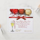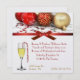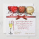 Bonito convite para festas de férias, com uma fotografia de bolas de ouro e Enfeites de natal vermelhos e estrelas reluzentes sobre fundo branco, no topo dos convites, com uma borda de uma fita e um arco de aspecto vermelho. Uma taça de vinho, no fundo, tem uma bengala doce pendurada no copo por um toque de chorona. Personalize o texto para atender às suas necessidades.