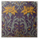 Dois azulejos quadrados com designs florais gravados em fundo roxo escuro. Cada azulejo apresenta um girassol grande e estilizado com numerosas pétalas e um centro detalhado, parecido com um girassol. As flores são posicionadas no topo de cada azulejo, com caules de cinza prateada e folhagem estendendo-se para baixo.