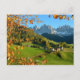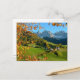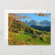 Cartão postal das Ruas. Aldeia de Magdalena ou Papai noel Maddalena, com a sua igreja característica em frente dos picos da montanha Geisler ou Odle Dolomites no Val di Funes (Villnosstal), em Itália, no outono.