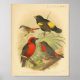 Ilustração de aves Vintage 1910. Pássaros vermelhos, amarelos e pretos sentados em um galho de árvore.