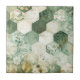 Ceramic Tile - Rustic hexagon patchwork with botanical florals, vintage script, and distressed textures in soft green, cream, and beige tones. Ideal for shabby chic lovers, crafters, and fans of cottagecore and antique-inspired aesthetics.