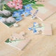 Uma pequena e macia Primavera, cordeja a cabeça pela janela de um ovo colorido de páscoa adornada com uma variedade de flores de primavera.