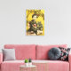 Este trabalho de arte retrata uma jovem guinada japonesa contra um pano de fundo de um design de bambu com um pequeno demônio mascarado no colo. Trabalho de arte oriental perfeito para a casa.