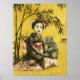 Este trabalho de arte retrata uma jovem guinada japonesa contra um pano de fundo de um design de bambu com um pequeno demônio mascarado no colo. Belo impressão oriental exótico para a casa artística.