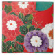 Padrão têxtil bordado japonês em bordado, de dahlias vermelhas, brancas e lavandas e folhas verdes, com melhoramentos digitais, em fundo vermelho profundo