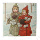 Vintage Little Girls carregando presentes caminham por uma rua nevada. Jenny Nystrom (1854 - 1946), artista sueca, desenhou a imagem do tema do Natal. Alma Wad alterou e adaptou o desenho da safra a esse azulejo cerâmico.