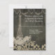 Chalkboard preto parece com creme macio que trabalho de arte floral. Cartão de retorno de resposta RSVP correspondente. Embora este trabalho de arte pareça vintage, ele foi pintado recentemente em pastéis por Audrey Jeanne Roberts em uma antiga paleta de cores parisiense e um conjunto de convites para casamento. Inspirada pela virada do papel de parede do século num pano floral com bordas de rolagem, a torre Eiffel ao fundo e um elegante candelabro. Linda letra de mão preenche o fundo junto com uma mão escrita "Paris". Há um conjunto completo de convites para casamento disponível para combinar. Direitos autorais.