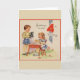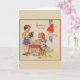 Cartão de saudação de aniversário retrô/vintage. Menino e menina adoráveis e seu filhote tendo uma festa de chá! Saudações No Seu Quarto Aniversário! Cartão de Aniversário Doce para uma criança de quatro anos!