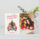 Um belo cartão com fotos de férias com as palavras "Papai Noel está vindo para a cidade" em uma face festiva com um caminhão d'água cheio de presentes, árvore de Natal e chapéu de Papai Noel. O verso tem um texto de marcador para sua própria carta de feriado. © 2020-Presente | Azeite Em Colheita | Todos os direitos reservados.