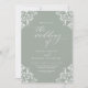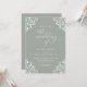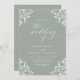 Este convite de casamento verde de sábio recentemente atualizado é elegante e elegante. Ele apresenta os cantos de vintage do ornamentado com a caligrafia vintage. É perfeito para um casamento verde elegante e elegante.