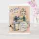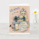 Cartão de saudação de aniversário retrô/vintage. Docinho costureira e seu cão costurando em uma velha máquina de costura! Parece que seu aniversário está aqui! Cartão de Aniversário Retroativo Adorável!