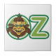 Imagem de contos de fadas clássicos da Vintage feita por William Wallace Denslow, do livro de histórias da Era Vitoriana O Maravilhoso Mago de Oz de L. Frank Baum. Grandes letras de texto que soletram a palavra 'OZ' com os óculos vestidos do Leão de Cowardly e estão felizes e sorrindo na letra O em Oz. Ele está rindo e se divertindo porque ele é corajoso e encontrou sua coragem na Cidade Esmeralda depois de seguir a Estrada Amarela com Dorothy e Toto.