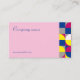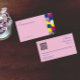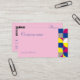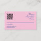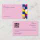 Aqui está um design cartão de visita. Ele tem um estilo geométrico minimalista com cores fuchsia, azul e amarela. É bom para cabeleireiros, maquiadores, consultores e profissionais de cosmetologia. Ele inclui um código QR para compartilhamento fácil de informações de contato e acesso ao site.