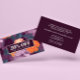 Moderno, mas com um toque retrô, cartão de desconto ou cupom de networking feminino apresentando imagem digital de flores inspiradas no estilo retrô numa paleta de cores burgundy escuro vibrante, laranja e roxo. Ótimo para beleza, moda, pequenos negócios, proprietários de lojas de roupas e profissionais de eventos.