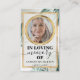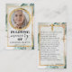 Cartão de oração totalmente personalizado com uma cruz decorativa na parte traseira e versos de oração que você pode personalizar. O cartão de oração vem com uma foto personalizável e personalizada e com um nome e data personalizados do funeral. O design apresenta um script e estilo de escrita manual/caligrafia junto com fontes elegantes e clássicas.