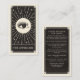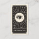 Este cartão de visita apresenta um design de estilo de placa de tarot em uma paleta de cores preta e creme. No verso está o espaço para detalhes sobre como cuidar das chibatadas após um tratamento. A ilustração mostra um olho místico com pestanas compridas cercadas por estrelas cintilantes. Isso seria perfeito para qualquer especialista em beleza, salão ou lash que prefere um cartão de visita no estilo do alternativo e quer tornar seu cartão de pós-tratamento de lixo memorável.