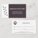 Um cartão de compromisso simples com patas de gato para todos os serviços de animais de estimação, como caminhador de cães, sentar-se em gatos, alimentação de coelhos, assistência a pássaros, abeberamento de plantas, embarque de animais de estimação, etc. Ele é totalmente personalizável e espera ajudá-lo em sua empresa a lembrar ao cliente seu próximo compromisso. Você pode adicionar um logotipo ou foto atrás.