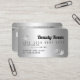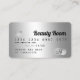 Um elegante e moderno, na moda belty Hair e um cartão de visita do estilo de cartão de crédito do artista maquiador com uma tipografia de fontes moderna num fundo de trendy de filme metálico de cinza prateado. todo o texto é personalizável, adicione suas mídias sociais. Apresentando falso stripe de prata. Adicione seu logotipo, seu monograma e código QR.