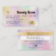 Um elegante e moderno, na moda, Cabelo de beleza e cartão de visita do estilo de cartão de crédito artístico de maquiagem, com uma tipografia de fontes moderna num fundo holográfico iridescente de náacre chic e de vidro metálico dourado. todo o texto é personalizável, adicione a mídia social. Apresentando uma fita de ouro falsa. Adicione seu logotipo, seu monograma e código QR.