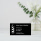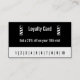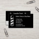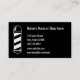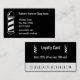 Back: Cartão de Lealdade preto e branco. Tire 20% da sua 10ª visita. Números 1 a 10. Frente: Um poste de barbeiro está à esquerda. Ao lado do polo de barbeiro estão campos para seu texto, como seu nome, nome comercial, endereço, número de telefone, email e/ou site. O texto é branco e o fundo é preto. Um poste de barbeiro está atrás.