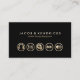 Este cartão de visita de equipamento de DJ para portáteis apresenta um fundo preto a jato. Cinco ícones de ouro relacionados à engenharia de áudio aparecem na metade inferior da placa, com seu nome comercial e slogan ou texto em negrito na metade superior. Seus detalhes de contato aparecem na parte traseira da placa. Os pequenos ícones criam um aspecto profissional impressionante.