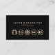 Este cartão de visita de serviços de engenharia de áudio apresenta um fundo preto a jato. Cinco ícones de ouro relacionados à engenharia de áudio aparecem na metade inferior da placa, com seu nome comercial e slogan ou texto em negrito na metade superior. Seus detalhes de contato aparecem na parte traseira da placa. Os pequenos ícones criam um aspecto profissional impressionante.