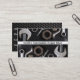 Cartões de visitas personalizados com fotografias de ferramentas mecânicas (chaves de porca, loucos e parafusos) sobre uma superfície refletora de fibra de carbono
