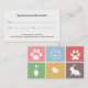 Este cartão de compromisso o ajudará em sua empresa a lembrar ao cliente o próximo compromisso. Pode ser adequado a todos os serviços de animais de companhia, como o veterinário, o andarilho de cães, a sentar-se em gatos, a alimentação de coelhos, a assistência a aves, a abeberamento das plantas, o embarque de animais de companhia, etc. As costas vêm com quadrados coloridos e imagens de patas de gatos, pata de cão, aquário, plantas com vaso, pássaros e coelhos - você pode mudá-los com suas próprias fotos, logotipos ou imagens