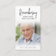 Foto Funeral Moderna Lembrando Nome Cartão de Oração. Mantenha a memória de uma pessoa amada próxima com este cartão de oração personalizado com uma foto tesourada, o título NOME REMEBERING, datas e uma mensagem de memória emocionante editável. Com o seu clássico design preto e branco e o seu moderno guião manuscrito, ele faz um importante esforço para partilhar num funeral, num serviço de memorial ou na Celebração da Vida e oferece conforto e um tributo duradouro à família e aos amigos. Seu pequeno e portátil tamanho de 3,5x2" (tamanho de carteira) torna conveniente que os entes queridos o carregar com eles como um lembrete da vida e do espírito de seu ente querido.
