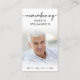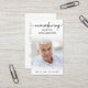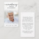 Simples Foto Funeral Lembrando Nome Cartão de Oração Moderno. Mantenha a memória de uma pessoa amada próxima com este cartão de oração personalizado com uma foto tesourada, o título NOME REMEBERING, datas e uma mensagem de memória emocionante editável. Com a sua simples design preto e branco clássico e a moderna tipografia de escrita manuscrita, ela faz uma manutenção significativa para compartilhar num funeral, num serviço de memorial ou na Celebração da Vida e oferece conforto e um tributo duradouro à família e aos amigos. Seu pequeno e portátil tamanho de 3,5x2" (tamanho de carteira) torna conveniente que os entes queridos o carregar com eles como um lembrete da vida e do espírito de seu ente querido.