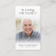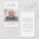 Cartão De Oração De Memória Encantadora De Foto Funeral. Mantenha a memória de um ente querido perto com este cartão de oração personalizado com uma foto tesourada, o título EM MEMÓRIA DE AMOR, o nome e as datas e uma mensagem editável de lembrança do coração. Com a sua simples, mas elegante design preto e branco clássico e a elegante caligrafia, ela faz uma manutenção significativa para compartilhar num funeral, num serviço de memorial ou na Celebração da Vida e oferece conforto e um tributo duradouro para a família e os amigos. Seu pequeno e portátil tamanho de 3,5x2" (tamanho de carteira) torna conveniente que os entes queridos o carregar com eles como um lembrete da vida e do espírito de seu ente querido. A personalização torna cada placa única.