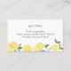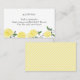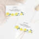 Adicione um toque fresco e alegre à sua noiva ou chá de fraldas com este cartão de informações do registro com tema limão, perfeitamente dimensionado para se encaixar em convites. Apresentando limões aquosos e verde com tipografia moderna e limpa, este cartão é uma maneira charmosa e prática de compartilhar detalhes do registro de presentes com os convidados. Seu pequeno tamanho de cartão de visita torna-o ideal para enviar e-mails e fácil para os hóspedes de se manter à mão. Um encantador complemento para todos os citros, jardins ou comemorações de verão.