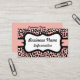 Um bonito padrão rosa e leopardo preto enfeita esta cartão de visita profissional. Personalize esta cartão de visita para atender às suas necessidades. O design é de arte original. Use este cartão de visita de na moda para um compro de beleza, cosmetólogo, salão de cabelo, salão de unhas, moda, boutique, padaria, estilista de cabelo, salão, spa, músico, maquiador, etc...
