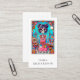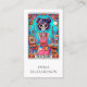 Um cartão de visita de professor de arte super divertido no estilo do cartão tarot, com um esqueleto pintado em um estúdio de arte colorido.