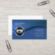 Este simples cartão de visita de editor de vídeo elegante e profissional apresenta um fundo azul. Um fluxo de onda azul da esquerda para a direita, dividindo a placa em duas seções. Um ícone circular de clipe de cromo está sentado nesta onda, no lado esquerdo da placa, enquanto seu nome e título aparecem no canto superior esquerdo e seu nome comercial e detalhes de contato aparecem no canto inferior direito. Projetado para câmera, foto, fotógrafo, imagem digital, edição digital, temas de filme.