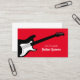 Modelo de cartão de negócios de aulas de guitarra elétrica. Cartões de visita profissionais com o logo do instrumento de guitarra. Cartões de visita modernos para guitarristas que dão aulas particulares, artistas, compro, loja, nova empresa, chefe de estúdio, funcionários, DJs, produtor de música, cantor, banda de música, professor de música, instrutor, músico, etc. Escolha entre diferentes qualidades de papel e espessuras. Tamanho Padrão. Cor de fundo vermelha ou personalizada.