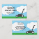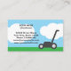 Modelo de cartão de negócios simples de corte de grama para jardineiro. Design com cortador, grama verde, céu azul e nuvens brancas. Perfeito para jardineiros ou paisagistas independentes que cuidam de jardins, jardins, campos, parques e outros.