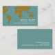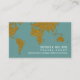 Cartão profissional moderno azul-lacrimogêneo com nome (estilo de fonte 'unica um') e ocupação personalizada relacionada ao viagem (agente viagem) e a imagem de um mapa falho dourado do mundo... e modelos para endereço, email e telefone no verso...